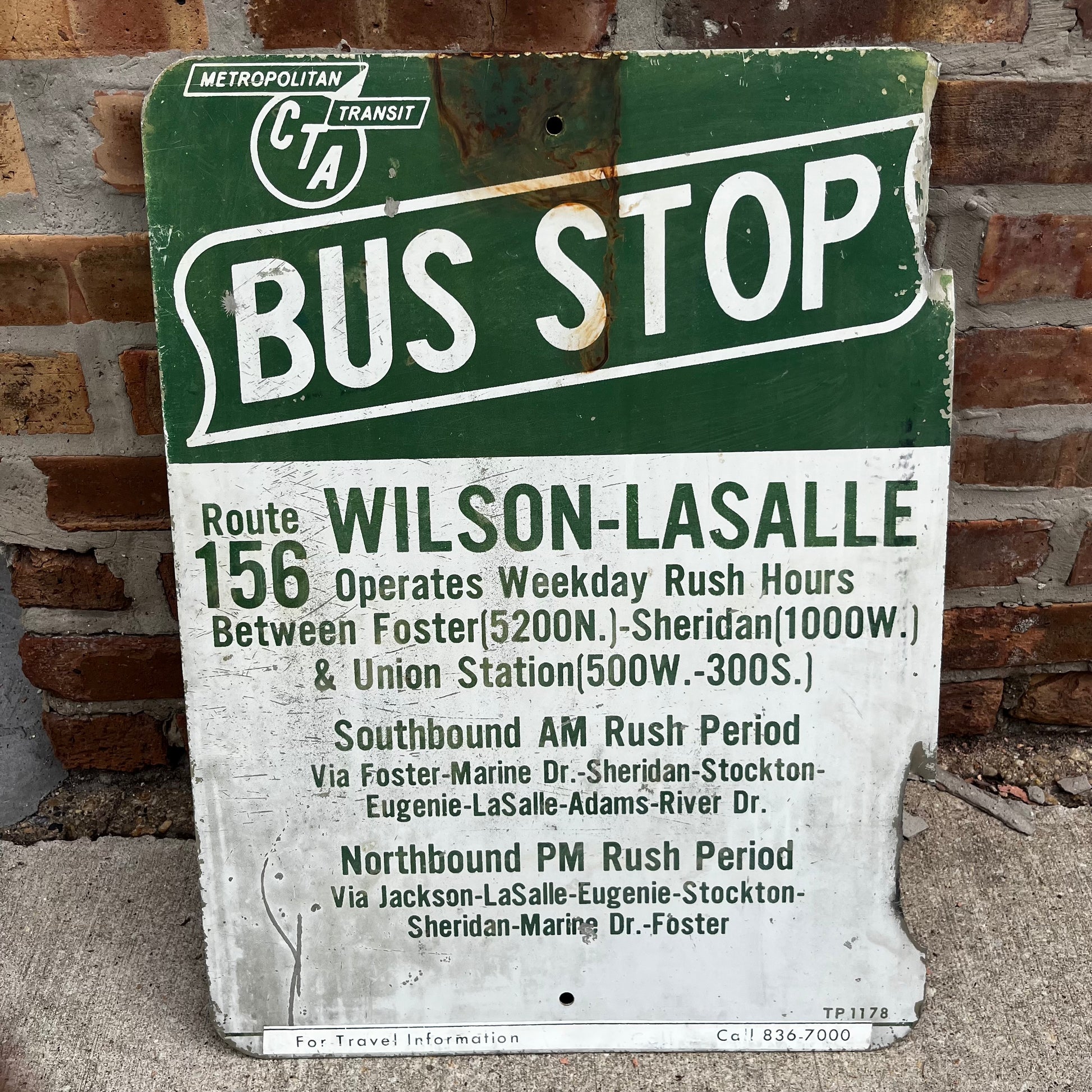 1960s Double sided Chicago Transit Authority (CTA) Bus stop sign. Route 156 between Wilson-Lasalle. Measures 24 x 17 inches.