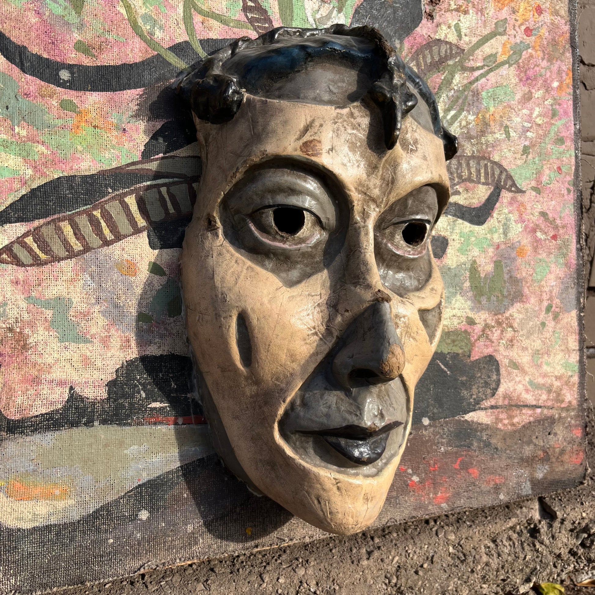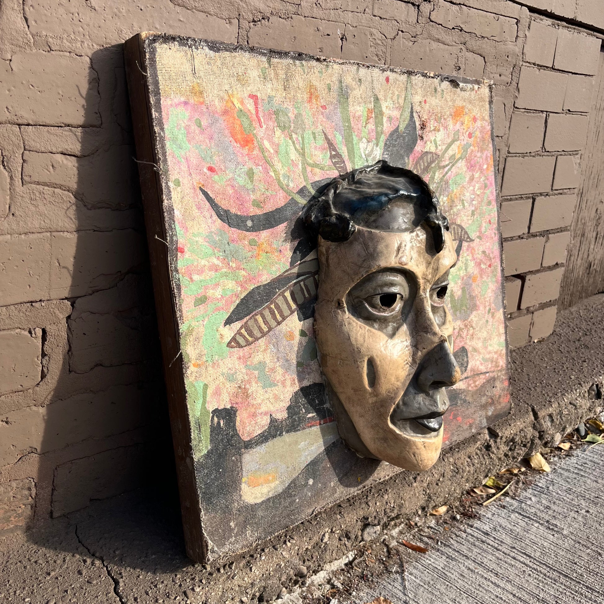 1960s Mixed media Día de los Muertos mask on canvas.