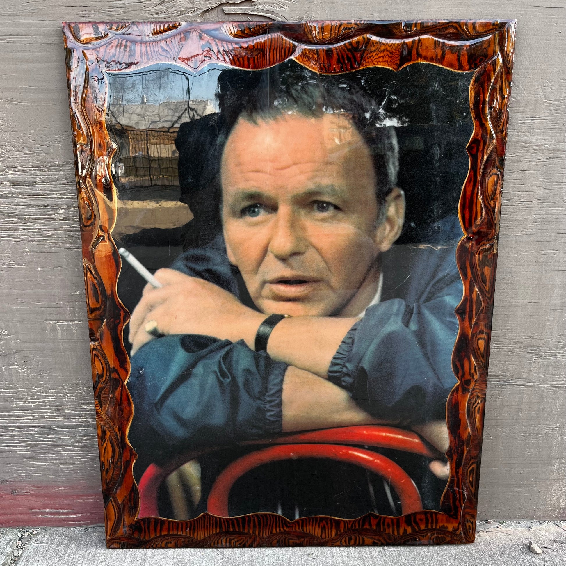 1970s Wooden Frank Sinatra poster in resin. Measures 32 x 24 inches.