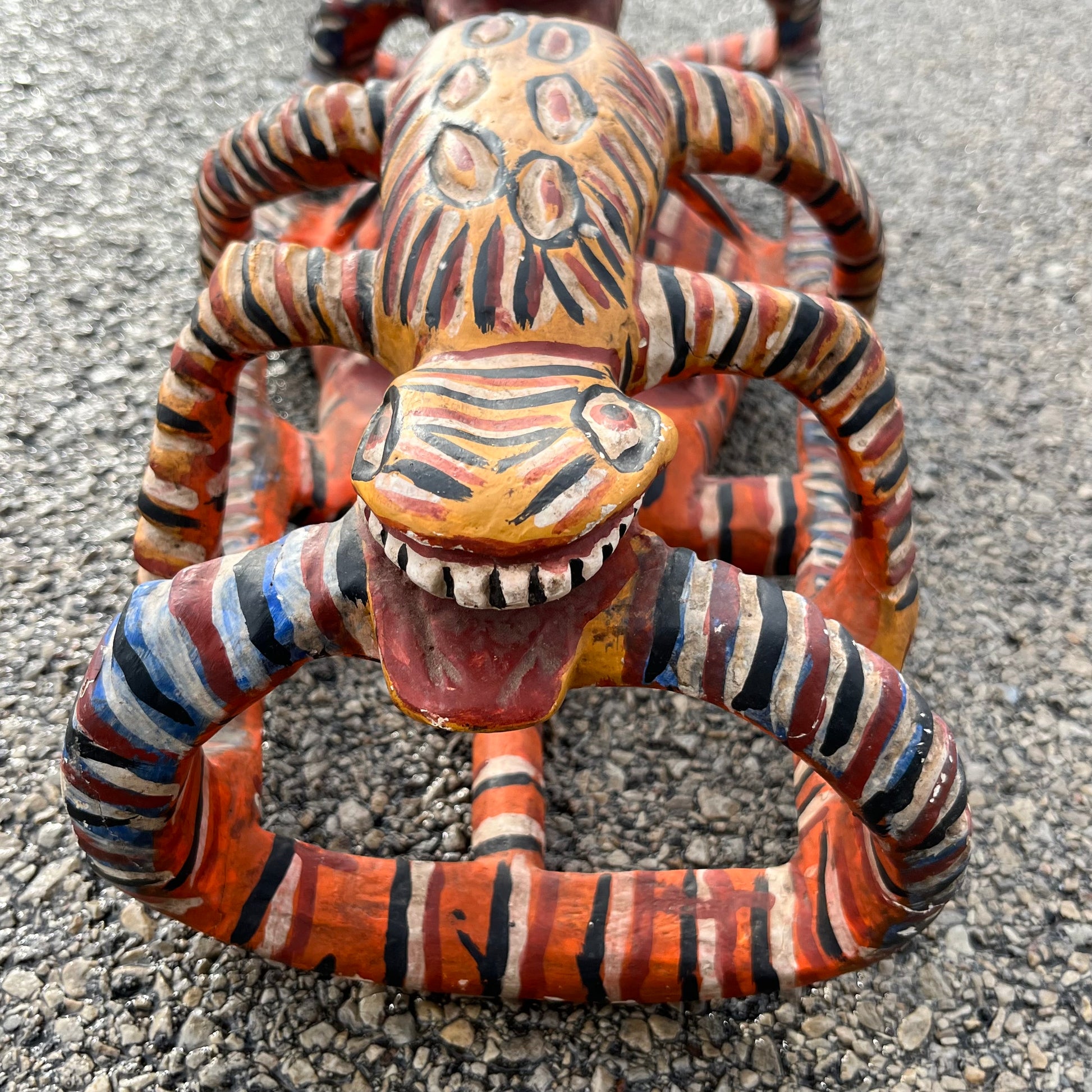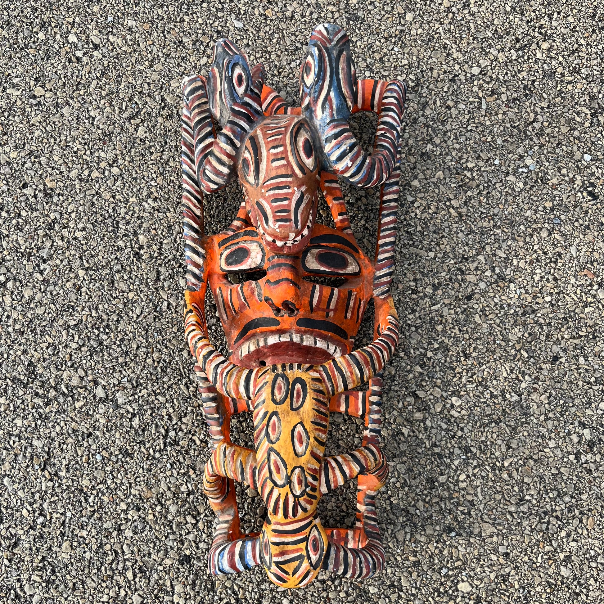 1970s Wooden serpent devil mask from Jaleaca de Catalan. Measures 21 x 19 inches.