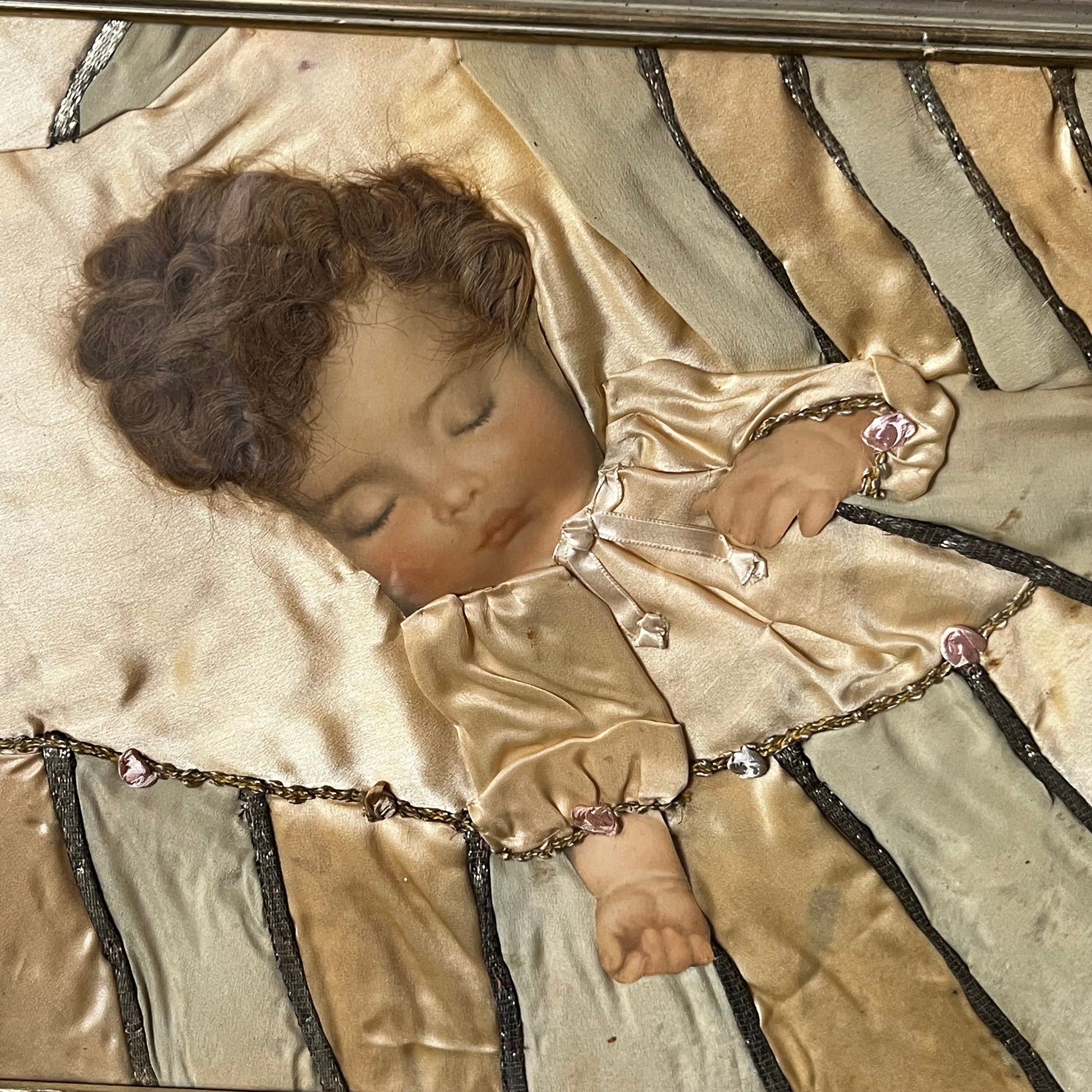 Early 1900s Sleeping baby portrait made with real hair and silk.