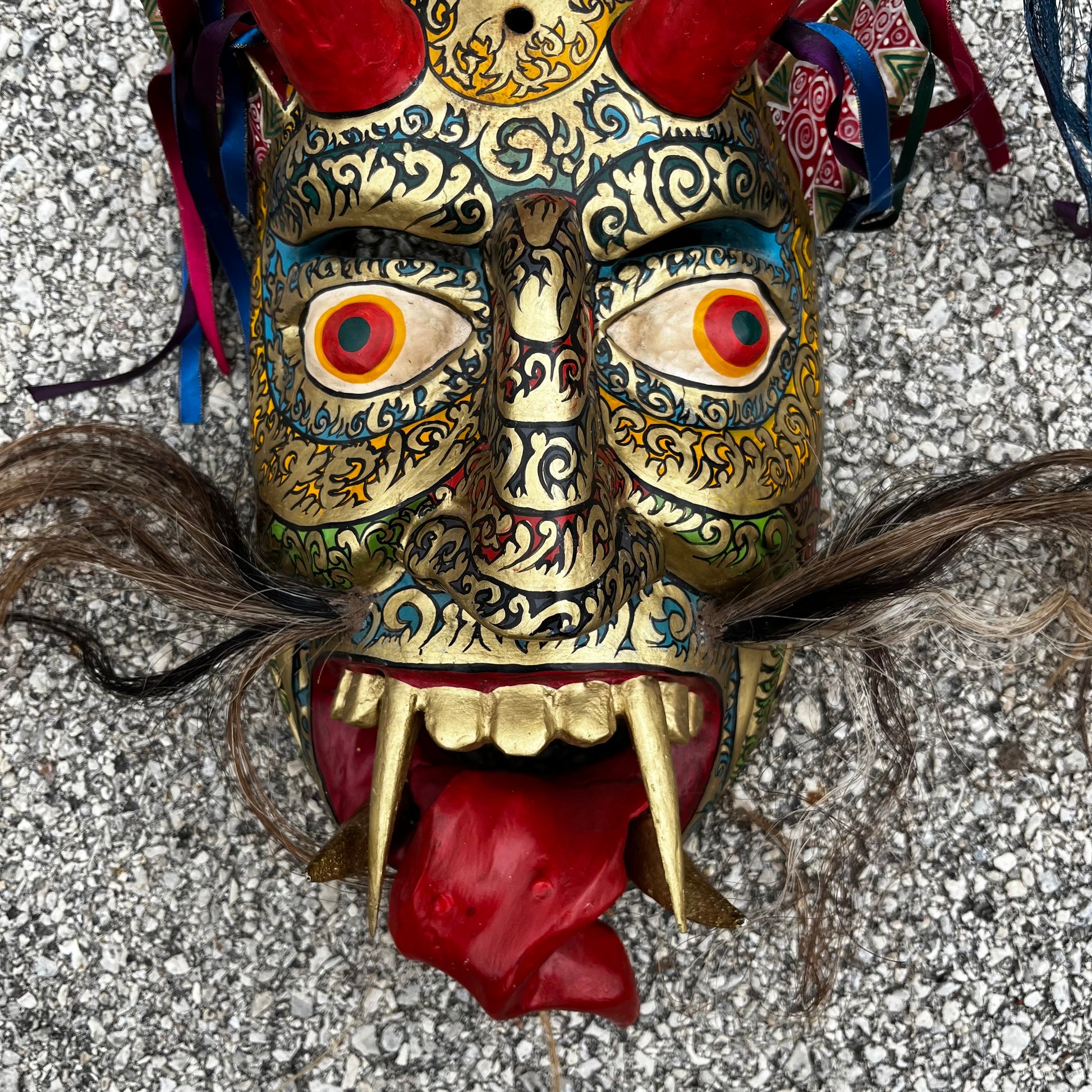 Large ceremonial Diablo mask with ribbons and horse hair.